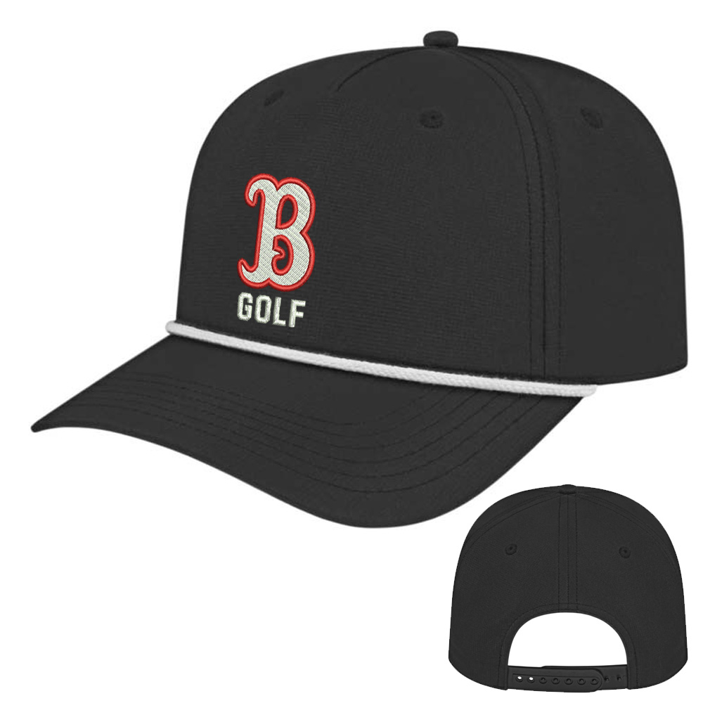 Medium profile five panel structured cap Modified flat visor 100% polyester performance fabric UV protection and moisture wicking Braided rope accent Adjustable plastic snap tab closure