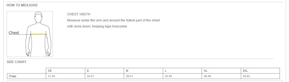 Chest: XS 16 1/4 S 18 1/4 M 20 1/4 L 22 1/4 XL 24 1/4 2XL 26 1/4