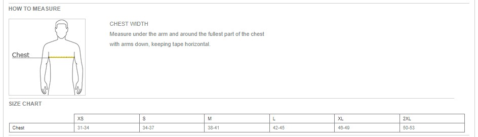 Chest: XS 18 S 19 1/2 M 21 1/2 L 23 1/2 XL 25 1/2 2XL 27 1/2 3XL 29 1/2