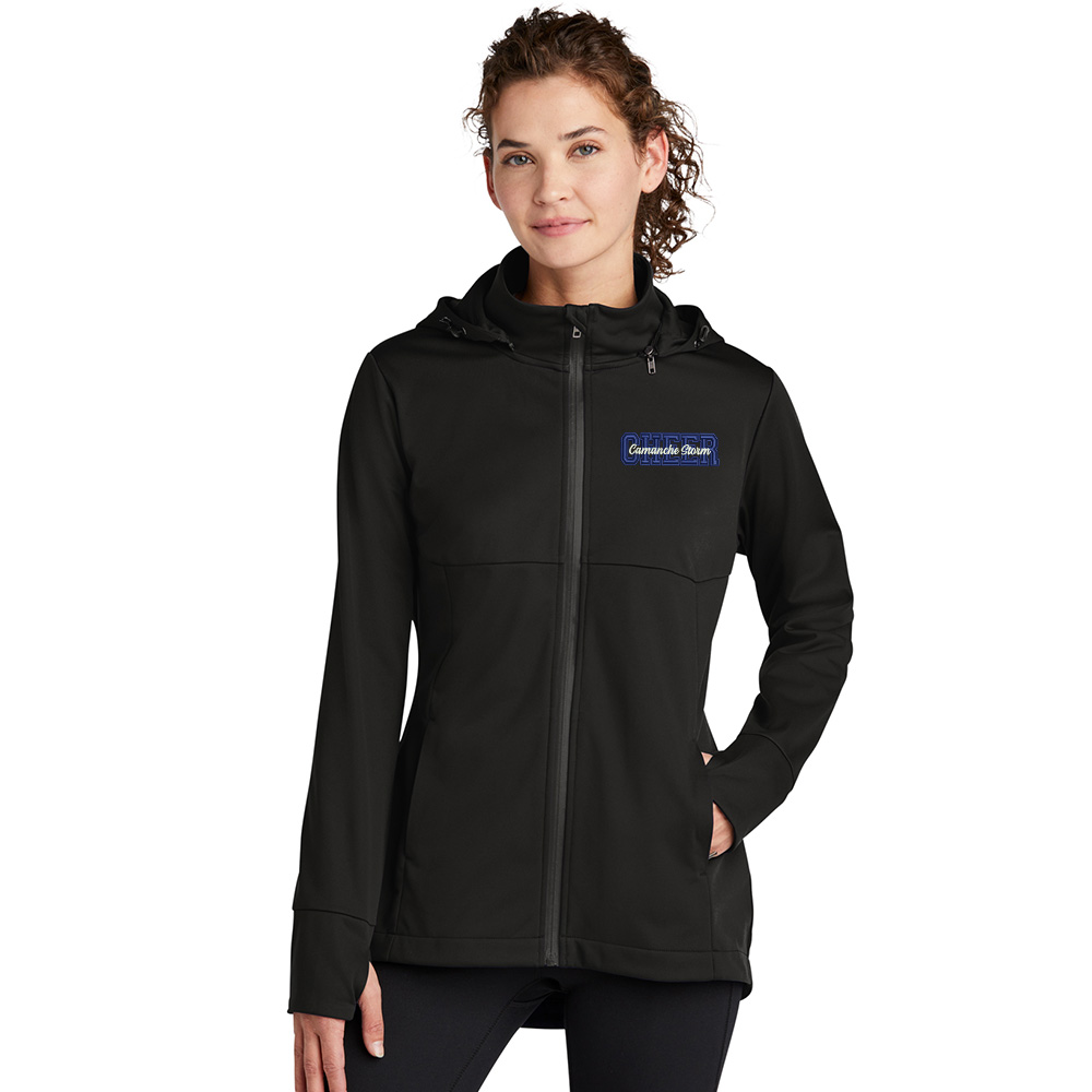 100% polyester knit shell with a durable water-repellent (DWR) coating bonded to a water-resistant film insert and a 100% polyester brushed tricot interior