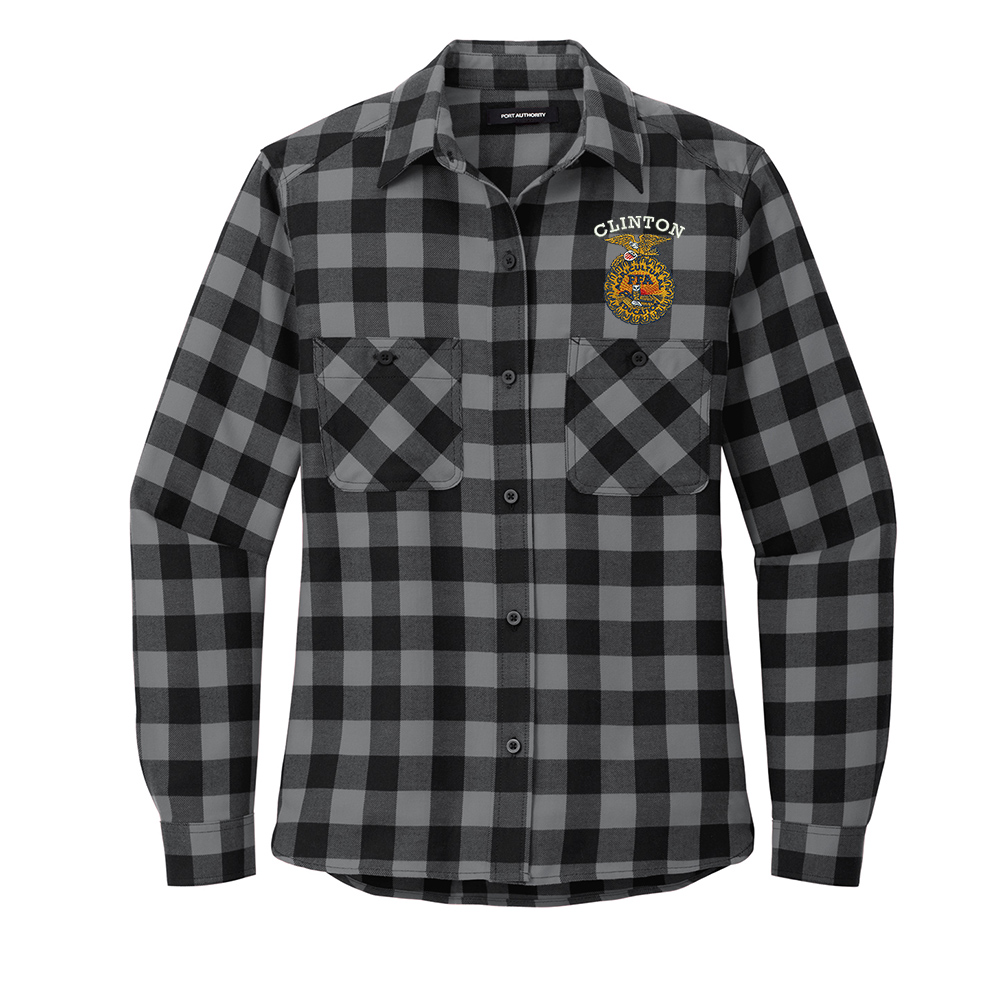 Clinton FFA Port Authority Ladies Plaid Flannel Shirt-Grey Black Buffalo Check