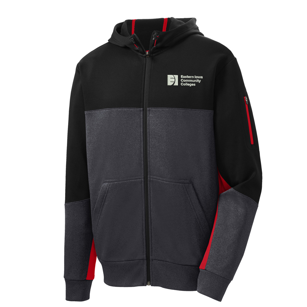 With contrast color detailing throughout, this double-knit jacket is right on trend with moisture-wicking performance and a left sleeve pocket for your phone or MP3 player.