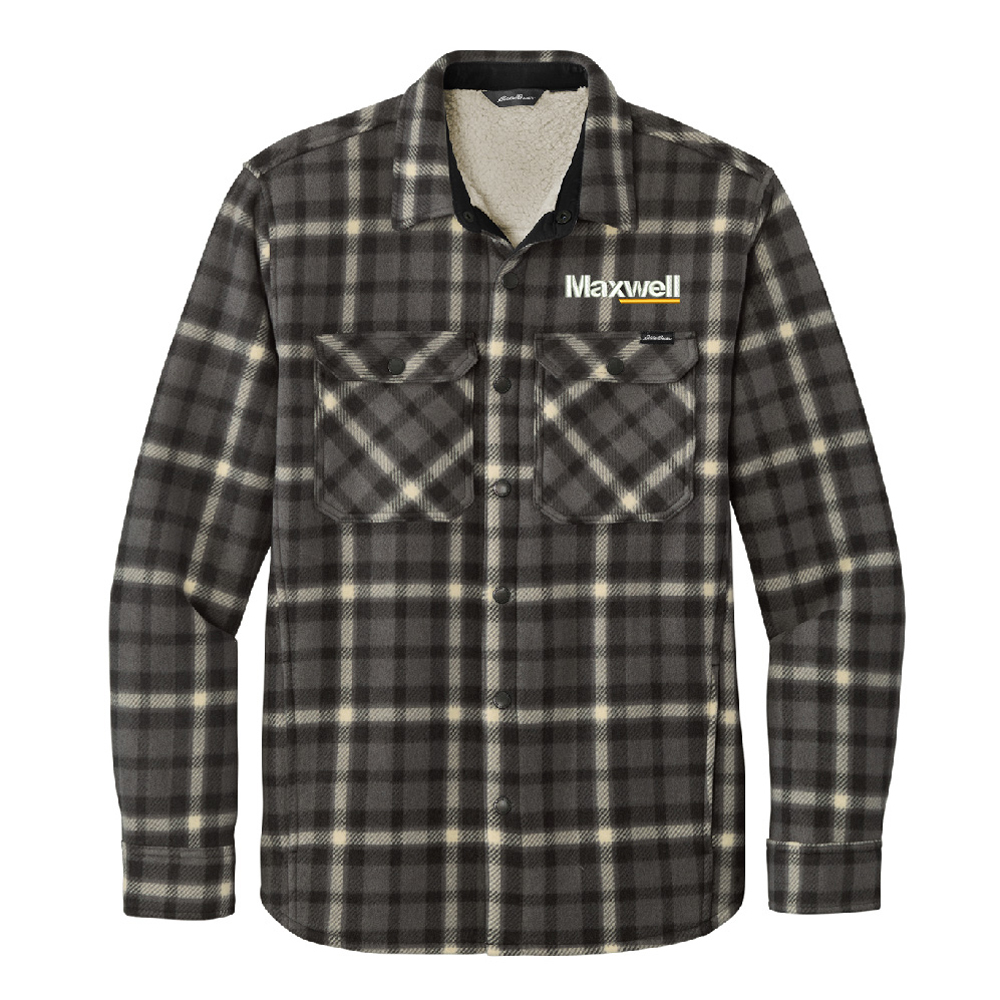 Whether youre spending time inside or outside in cool temps, the high-pile fleece interior of these rugged-looking shirt jacs will keep you warm. Eddie Bauer logo snap-front closure and snap-close chest pockets. Handwarmer pockets. Eddie Bauer woven label at left chest pocket. Made of 10.3-ounce, 100% polyester microfleece bonded with 100% polyester high-pile fleece interior. 100% polyester woven details.