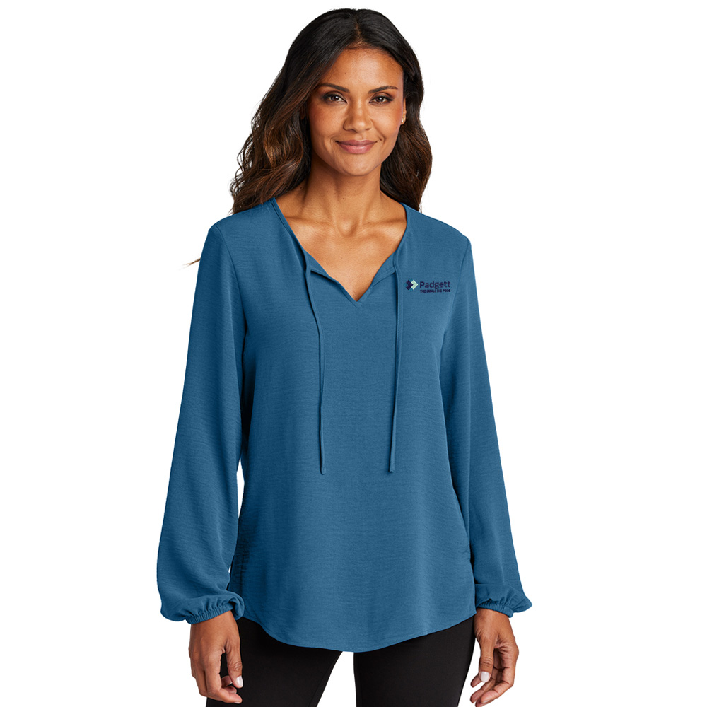 A fresh neckline with tie gives this comfortably flowy blouse a sophisticated look.