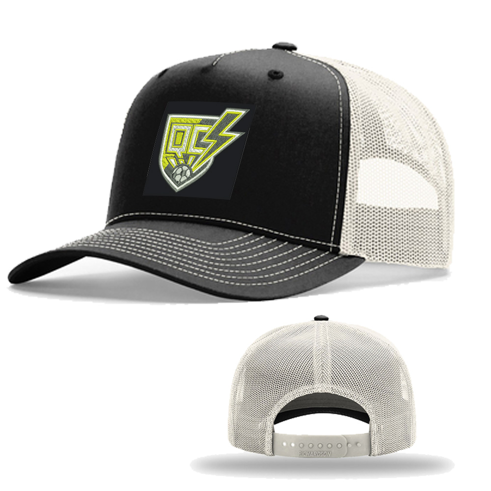 QC Strikers Soccer Richardson Five Panel CHAMP High Profile Trucker mesh snap back cap Split color-Black/Birch