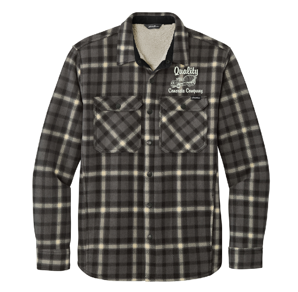 Whether youre spending time inside or outside in cool temps, the high-pile fleece interior of these rugged-looking shirt jacs will keep you warm. Eddie Bauer logo snap-front closure and snap-close chest pockets. Handwarmer pockets. Eddie Bauer woven label at left chest pocket. Made of 10.3-ounce, 100% polyester microfleece bonded with 100% polyester high-pile fleece interior. 100% polyester woven details.