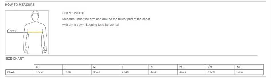 Chest: S 19 3/4 M 21 1/4 L 22 3/4 XL 24 1/4 2XL 25 3/4 3XL 27 3/4 4XL 29 3/4