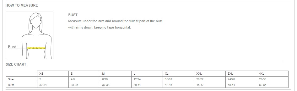 Bust: XS 19 1/4 S 20 1/4 M 21 1/4 L 22 3/4 XL 24 1/4 2XL 25 3/4 3XL 27 3/4 4XL 29 3/4