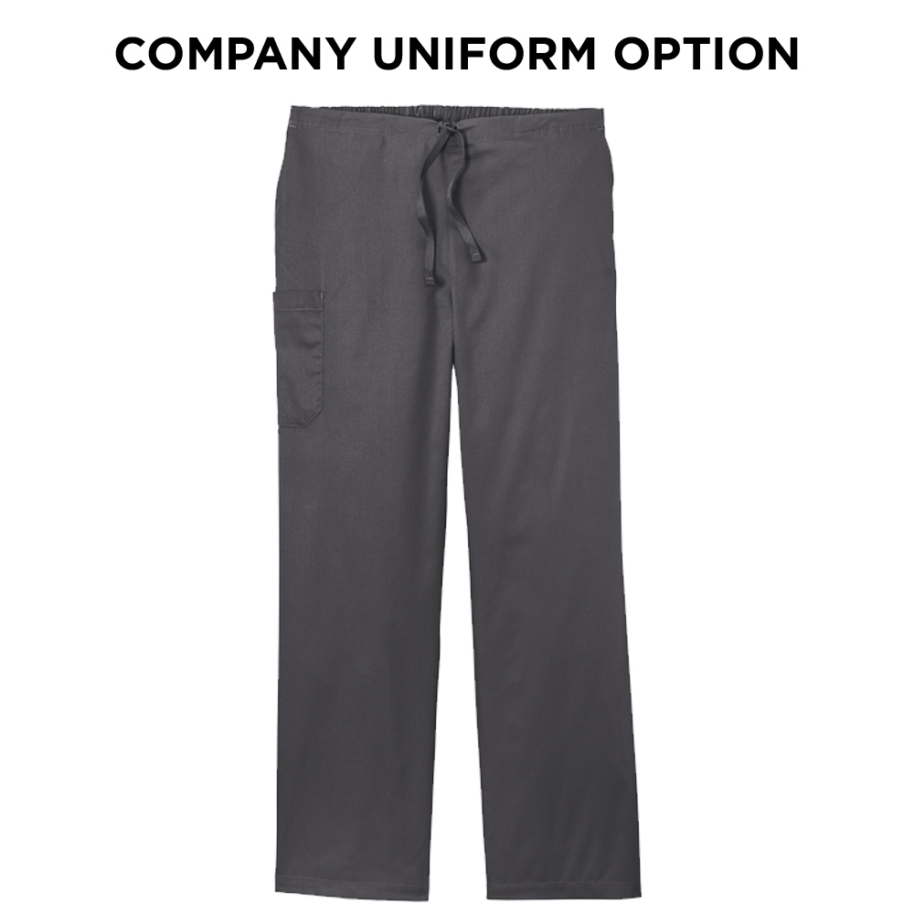 Flat front full drawstring and half-back elastic waistband